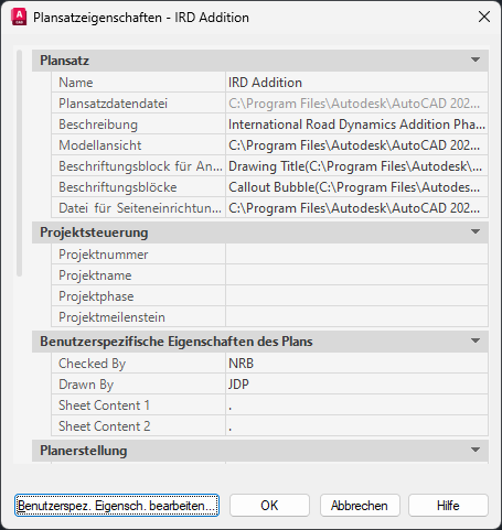 Zu diesen Informationen gehören Pfad und Dateiname der DST-Datei (Plansatzdaten), die Pfade zu den Ordnern, in denen die Zeichnungsdateien der Plansätze abgelegt sind und alle mit dem Plansatz verbundenen benutzerspezifischen Eigenschaften