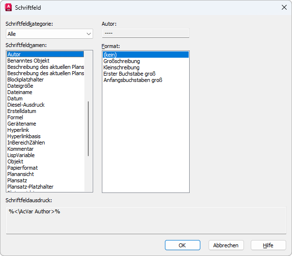 Zeigt den Ausdruck an, der dem Schriftfeld zugrunde liegt. Der Schriftfeldausdruck kann zwar nicht bearbeitet werden, dieser Bereich gibt jedoch Aufschluss darüber, wie Schriftfelder aufgebaut sind.