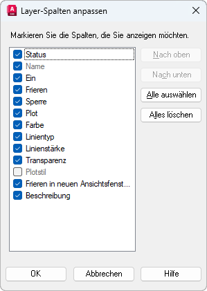 Legt fest, welche Spalten im Layereigenschaften-Manager auf der aktuellen Registerkarte Modell oder Layout angezeigt werden.
