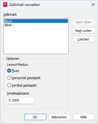 Listet den gesamten Text und/oder alle Blöcke in der ausgewählten Zelle in der Anzeigereihenfolge auf. Text wird mit der Bezeichnung Tabellenzellentext gekennzeichnet. Blöcke werden durch die Bezeichnung Block gefolgt vom Blocknamen gekennzeichnet.