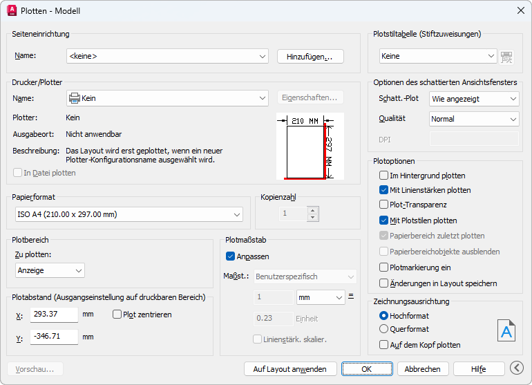 Zur Festlegung der Einstellungen für Gerät und Ausgabemedium sowie zum Plotten der Zeichnung.