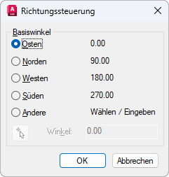 Legt die Richtung des Nullwinkels fest. Diese folgenden Optionen beeinflussen die Eingabe von Winkeln, das Anzeigeformat sowie die Eingabe von Polar-, Zylinder- und Kugelkoordinaten.