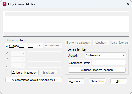 Dient zur Auswahl, Bearbeitung und Benennung von Filtern für die Objektwahl.