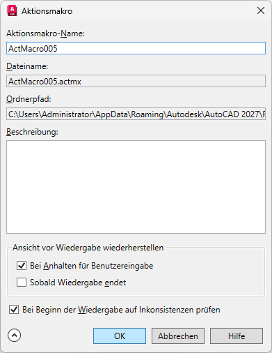 Sie können das aktuelle Aktionsmakro speichern oder umbenennen und sein Wiedergabeverhalten definieren. Die Anzeige dieses Dialogfelds kann unterdrückt werden, indem Sie die Einstellung Aufforderung für Aktionsmakro-Name im Dialogfeld Aktionsrekorder-Voreinstellungen deaktivieren.