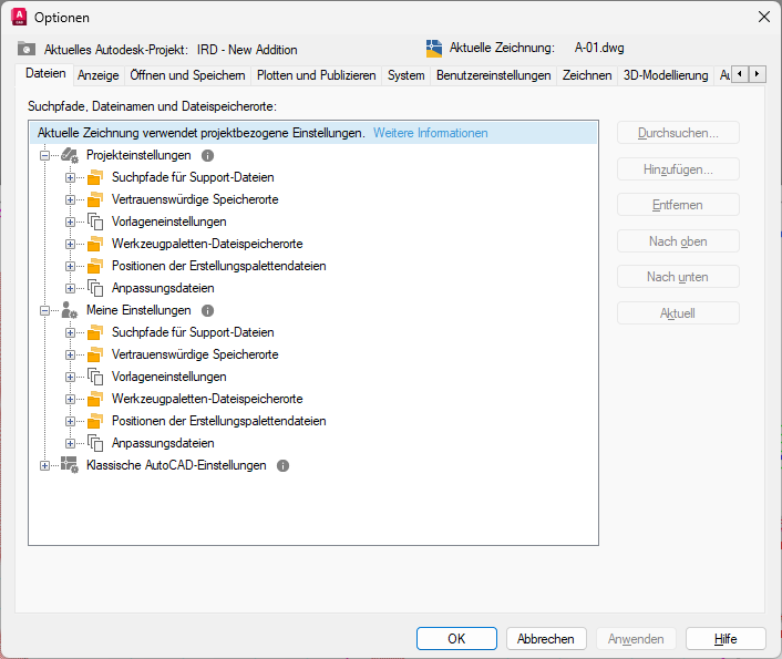 Weitere Informationen zum Ändern der Pfade für verbundene Support-Dateien finden Sie unter So legen Sie die Pfade für verbundene Support-Dateien eines Autodesk-Projekts fest.