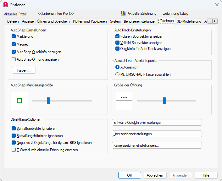 Legt die Optionen für verschiedene Bearbeitungsfunktionen fest, einschließlich AutoSnap und AutoTrack.