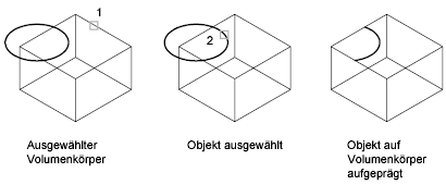 Die folgenden Objekte können durch Aufprägen auf 3D-Volumenkörpern oder Flächen bearbeitet werden: Bogen, Kreise, Linien, 2D- und 3D-Polylinien, Ellipsen, Splines, Regionen, Körper sowie weitere 3D-Volumenkörper.