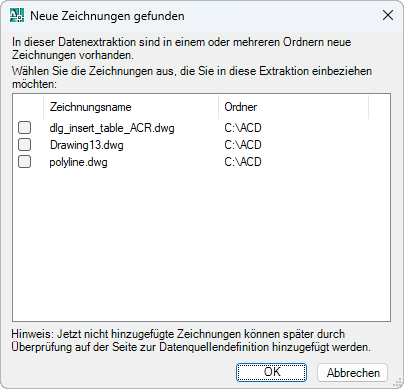 Zeigt eine Liste der neuen Zeichnungen an, die dem Ordner hinzugefügt wurden, der für die Datenextraktion ausgewählt wurde, nachdem diese ausgeführt wurde.