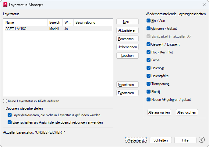 Listet die Layerstatus auf, die in der Zeichnung gespeichert wurden.