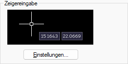 Wenn die Zeigereingabe (Cursoreingabe) aktiviert ist und ein Befehl ausgeführt wird, wird die Position des Fadenkreuzes in den QuickInfo-Eingabefeldern neben dem Cursor angezeigt. Sie können Koordinaten in die QuickInfo anstatt in die Befehlszeile eingeben.
