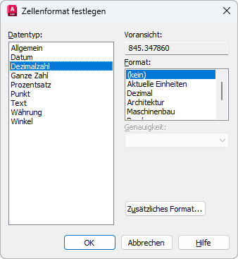 Abhängig vom ausgewählten Datentyp wird eine Liste relevanter Formattypen angezeigt. Wenn Sie beispielsweise Winkel als Datentyp auswählen, sind unter Format Optionen wie Dezimalgrad, Grad, Bogenmaß usw. verfügbar.