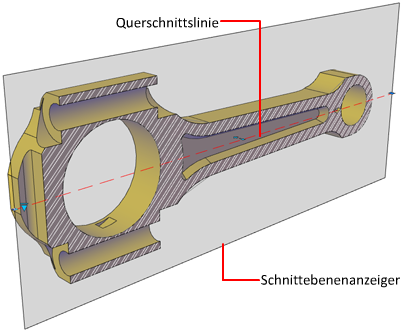 Schnittobjekte verfügen über einen transparenten Schnittebenenindikator, der als Schnittebene fungiert. Um verschiedene Schnittansichten zu erhalten, kann diese Ebene durch ein 3D-Modell bewegt werden, das aus 3D-Volumenkörpern, Oberflächen oder Regionen besteht.