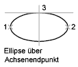 Erstellt mithilfe eines Mittelpunkts, des Endpunkts der ersten Achse und der Länge der zweiten Achse eine Ellipse. Sie können die Abstände festlegen, indem Sie eine Position im gewünschten Abstand anklicken oder indem Sie einen Wert für die Länge eingeben.