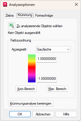 Berechnet den Bereich innerhalb der maximalen und minimalen Werte aller für die Krümmungsanalyse ausgewählten Objekte (Systemvariablen VSACURVATUREHIGH und VSACURVATURELOW).