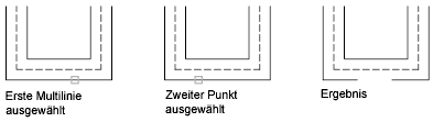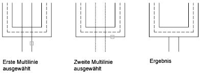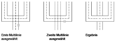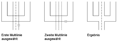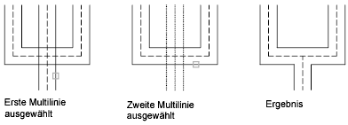 Erstellt zwischen zwei Multilinien einen Schnittpunkt mit offenen Linien. Alle Elemente der ersten Multilinie und nur die äußeren Elemente der zweiten Multilinie werden aufgebrochen.