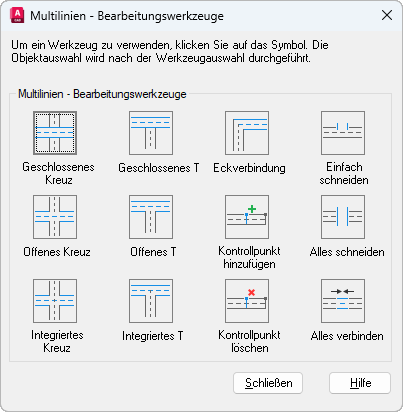 Dieses Dialogfeld enthält Werkzeuge und Voransichten in vier Spalten. Die erste Spalte steuert Multilinien mit Schnittpunkten, die zweite Spalte Multilinien in T-Form, die dritte Eckverbindungen und Kontrollpunkte und die vierte Unterbrechungen in Multilinien.