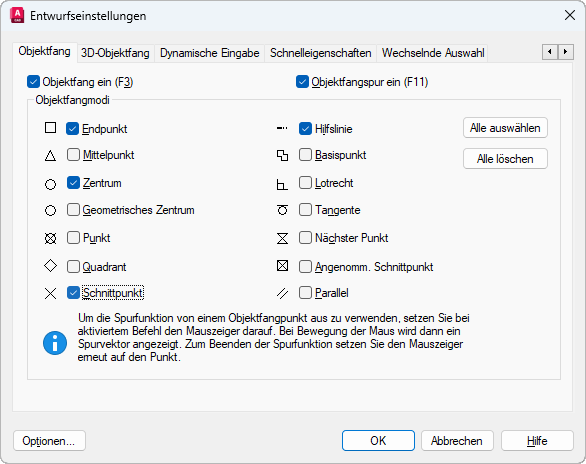Steuert die aktuellen Einstellungen für den Objektfang.