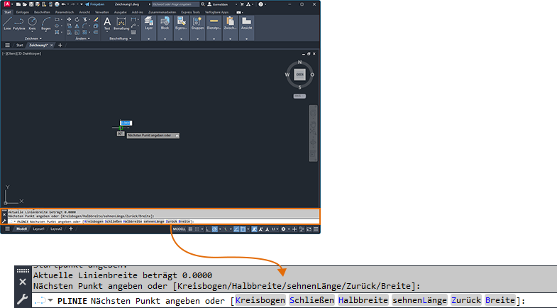 Blenden Sie das Befehlsfenster durch Drücken von STRG+9 ein oder aus, oder über die Multifunktionsleiste (). Wenn Sie das Befehlszeilenfenster ausblenden, können Sie weiterhin Befehle in die dynamische QuickInfo eingeben. Einige Befehle und Systemvariablen geben im Befehlsfenster jedoch Werte zurück, sodass Sie das Fenster in diesen Fällen gegebenenfalls einblenden sollten.