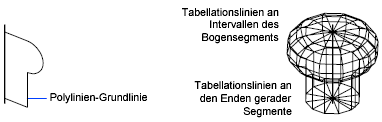 Die Dichte des erzeugten Netzes wird von den Systemvariablen SURFTAB1 und SURFTAB2 gesteuert. Die Variable SURFTAB1 bestimmt die Anzahl der Tabellationslinien, die in die Drehrichtung gezeichnet werden sollen. Die Tabellationslinien werden in gleich großen Abständen gezeichnet, die durch SURFTAB2 definiert werden, wenn die Grundlinie eine Linie, ein Bogen, ein Kreis oder eine einem Spline angepasste Polylinie ist. Wenn als Grundlinie eine Polylinie verwendet wird, die nicht an einen Spline angepasst ist, werden die Tabellationslinien an den Enden gerader Segmente gezeichnet, wobei jedes Bogensegment in die durch SURFTAB2 definierte Anzahl von Intervallen aufgeteilt wird.