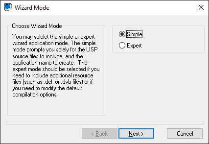 Experte – Ermöglicht es Ihnen, nicht nur die zu verwendenden LSP-Dateien und den Namen der zu erstellenden Anwendung anzugeben, sondern auch, welche Ressourcendateien (DCL- und DVB-Dateien) erforderlich sind sowie alle Änderungen an den Vorgabeoptionen für die Anwendung.