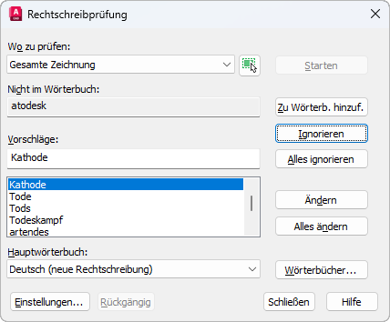 Prüft die Rechtschreibung für einzeiligen und mehrzeiligen Text, Multiführungslinien-Text, Text in Blockattributen, Text in Xrefs und zu Bemaßungen hinzugefügten Text.