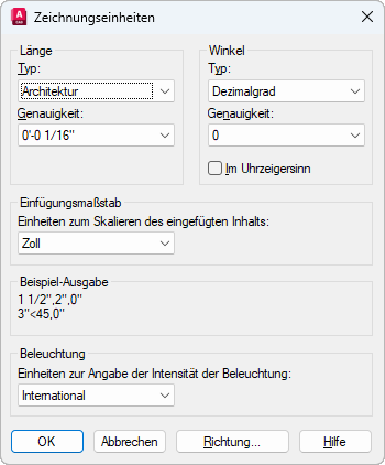 Die folgenden Werte stehen zur Verfügung: Architektur, Bruch, Dezimal, Maschinenbau und Wissenschaftlich. Die Formate Maschinenbau und Architektur verwenden eine Anzeige in Fuß und Zoll, wobei jede Zeicheneinheit einen Zoll darstellt. Die anderen Formate können jede beliebige SI-Einheit darstellen.