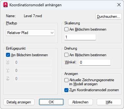 Gibt an, wie die Koordinationsmodelldatei gefunden und geladen wird: vollständiger (absoluter) Pfad, relativer Pfad(bezogen auf die übergeordnete Zeichnung), kein Pfad (Datei befindet sich im selben Ordner wie die übergeordnete Zeichnung). Der vorgabegemäße Pfadtyp ist Relativ. Verwenden Sie die Systemvariable REFPATHTYPE, um den vorgabegemäßen Pfadtyp zu ändern.