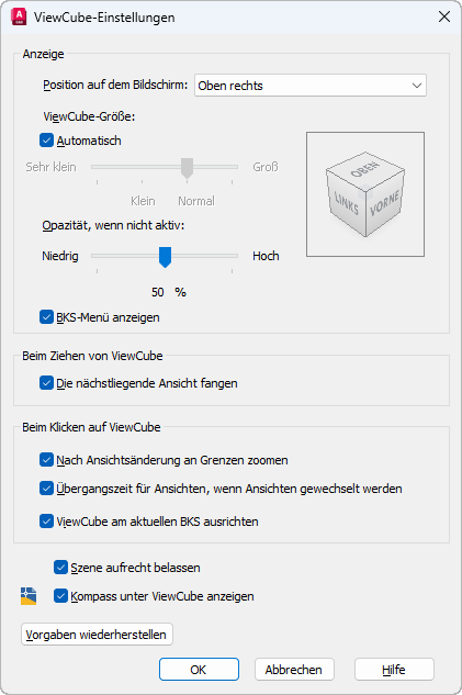 Wendet die Standardeinstellungen für das ViewCube-Werkzeug an.
