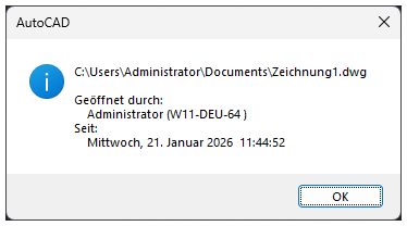 Nachdem Sie eine Zeichnungsdatei angegeben haben, werden Informationen angezeigt, einschließlich des vollständigen Pfads der Datei, den Anmeldenamen des aktuellen Benutzers, Computernamen und dem Datum und Uhrzeit des Öffnens der Zeichnungsdatei. Ähnliche Informationen werden automatisch angezeigt, wenn Sie eine Zeichnungsdatei öffnen möchten, die von einem anderen Benutzer geöffnet ist.