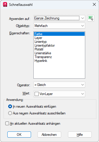 Wenn die Option An aktuellen Auswahlsatz anhängen gewählt ist, werden die Filterkriterien auf die gesamte Zeichnung angewendet.
