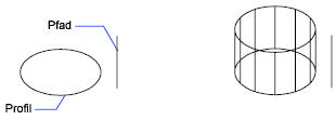 Legt den Extrusionspfad auf der Grundlage des ausgewählten Objekts fest. Der Pfad wird zum Schwerpunkt des Profils verschoben. Das Profil der ausgewählten Objekte wird dann entlang des ausgewählten Pfads extrudiert, um Volumenkörper oder Flächen zu erstellen.