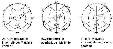 Die Position des Texts in bezug zur Maßlinie wird als vertikale Textplatzierung bezeichnet. Text kann oberhalb, unterhalb oder zentriert auf der Maßlinie platziert werden. Gemäß ANSI-Standard teilt auf der Maßlinie zentrierter Text diese in der Regel in zwei Hälften. Gemäß ISO-Norm befindet sich der Text im allgemeinen oberhalb bzw. außerhalb der Maßlinie. So kann Winkelbemaßungstext gemäß ISO-Norm eines der unten abgebildeten Formate haben.