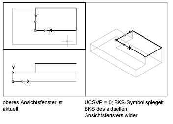 Das BKS in den einzelnen Ansichtsfenstern wird durch die Systemvariable UCSVP gesteuert. Sie können auch mit dem Befehl BKSMAN auf der Registerkarte Einstellungen darauf zugreifen. Wenn UCSVP für ein Ansichtsfenster auf 1 gesetzt ist, wird das zuletzt verwendete BKS mit dem Ansichtsfenster gespeichert; wenn Sie das betreffende Fenster zum aktuellen Ansichtsfenster machen, wird das BKS wiederhergestellt. Wenn UCSVP in einem Ansichtsfenster auf 0 gesetzt ist, entspricht dessen BKS stets dem BKS im aktuellen Ansichtsfenster.