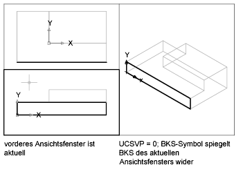 Sie können beispielsweise drei Ansichtsfenster einrichten: eine Draufsicht, Vorderansicht und eine isometrische Ansicht. Setzen Sie die Systemvariable UCSVP im Ansichtsfenster der isometrischen Ansicht auf 0, sodass Sie das BKS sowohl in der Draufsicht als auch in der isometrischen Ansicht verwenden können. Wenn Sie die Draufsicht zum aktuellen Ansichtsfenster machen, entspricht das BKS der isometrischen Ansicht dem BKS der Draufsicht. Umgekehrt wechselt das BKS der isometrischen Ansicht zum BKS der Vorderansicht, wenn Sie das zugehörige Fenster zum aktuellen Ansichtsfenster machen.