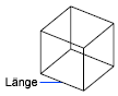 Erstellt einen Quader mit bestimmter Länge, Breite und Höhe. Wenn sie Werte eingeben, verläuft die Längenausdehnung entlang der X-Achse, die Breite entlang der Y-Achse und die Höhe entlang der Z-Achse. Wenn Sie zum Festlegen der Länge eine Punkt wählen, legen Sie auch die Drehung auf der XY-Ebene fest.