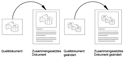 Das Verhältnis zwischen Einbetten und Verknüpfen lässt sich mit dem Verhältnis zwischen dem Einfügen eines Blocks und dem Erstellen einer externen Referenz vergleichen.