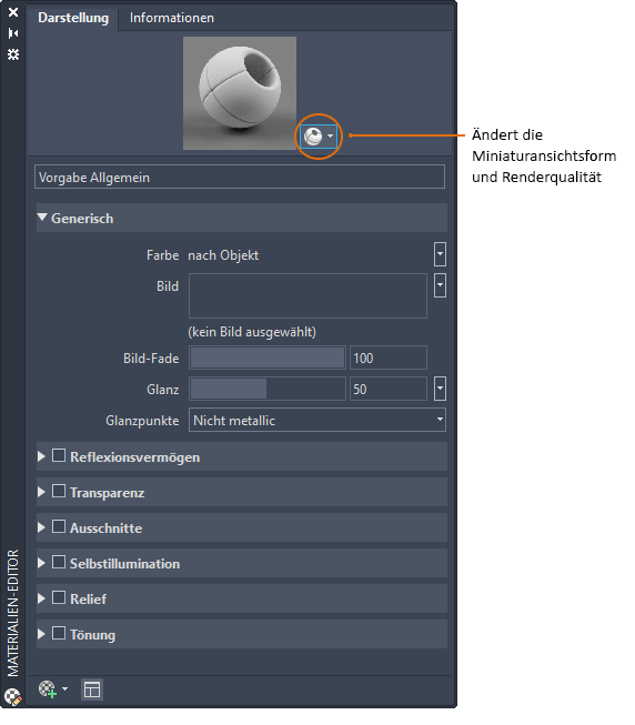 Enthält die Steuerelemente zum Bearbeiten der Materialeigenschaften.