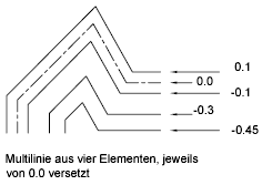 Zeigt alle Objekte im aktuellen Multilinienstil an. Jedes Objekt hat einen bestimmten Abstand von der Mitte der Multilinie, eine Farbe und einen Linientyp. Die Objekte werden absteigend nach Abständen geordnet aufgelistet.