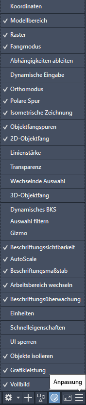 Anmerkung: Ein Häkchen zeigt an, dass das Element in der Statusleiste angezeigt wird.