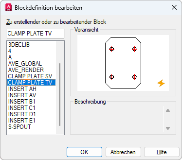 Zeigt eine Voransicht der ausgewählten Blockdefinition an. Ein Blitz deutet darauf hin, dass es sich um einen dynamischen Block handelt.