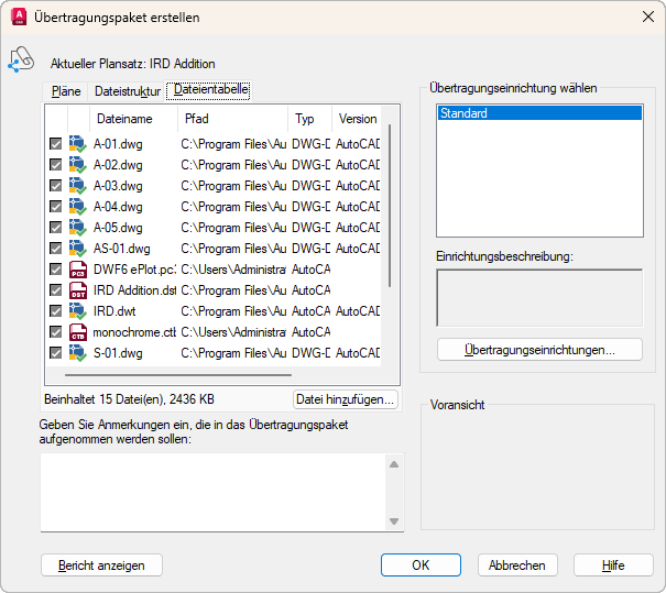 Zeigt Berichtsdaten an, die Bestandteil des Übertragungspakets sind. Dazu gehören alle Übertragungshinweise, die Sie eingegeben haben, sowie alle automatisch erstellten Verteilungshinweise. In den Verteilungshinweisen werden die Schritte beschrieben, die für eine korrekte Funktionsweise des Übertragungspakets durchgeführt werden müssen. Beispiel: Wenn eine Übertragungszeichnung SHX-Schriften enthält, wird angegeben, wohin Sie die Dateien kopieren müssen, damit diese in dem System, auf dem das Übertragungspaket installiert wird, erkannt werden. Wenn Sie eine Textdatei mit Vorgabeanmerkungen erstellt haben, werden diese Anmerkungen ebenfalls in den Bericht einbezogen.