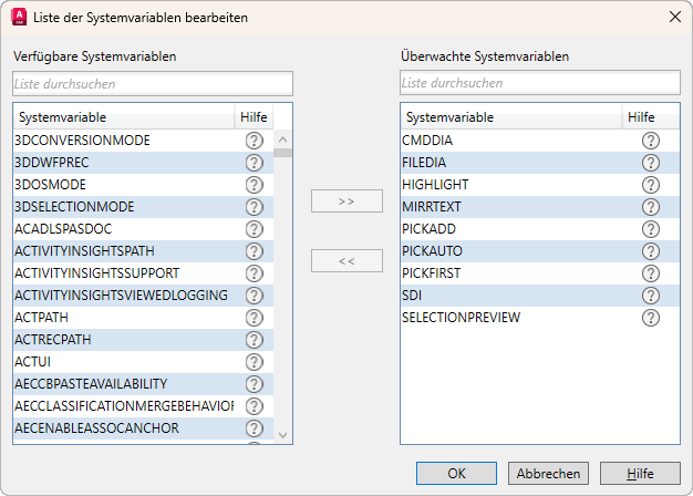 SYSVARÜBERW (Befehl): Liste bearbeiten