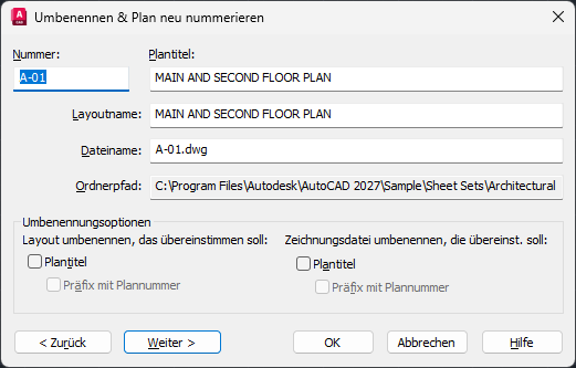 Lädt den nächsten Plan in dieses Dialogfeld. Diese ist eine einfache Möglichkeit, eine Reihe von Plänen neu zu nummerieren oder umzubenennen.