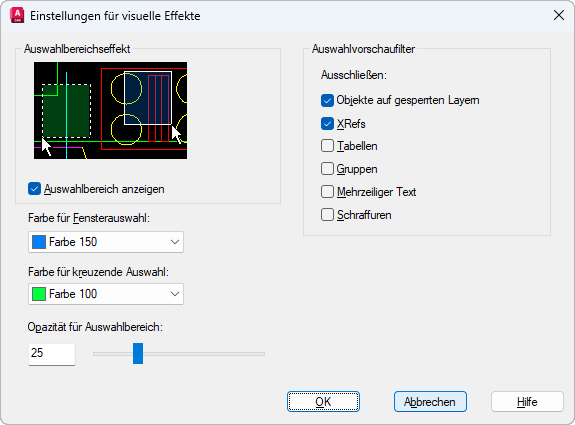 - Schließt Objekte auf gesperrten Layern von der Auswahlvorschau aus. Vorgabemäßig ist diese Option aktiviert. (Systemvariable PREVIEWFILTER)