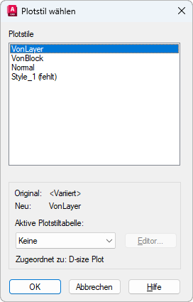 Zeigt die verfügbaren Plotstile an, einschließlich des Standardplotstils NORMAL. Ein Plotstil besteht aus einer Sammlung von Eigenschaften, die beim Plotten angewendet werden.