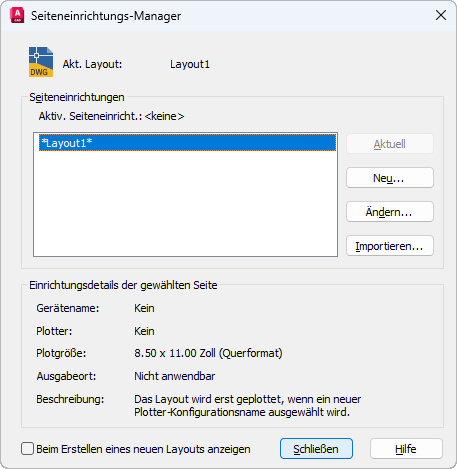 Hier können Sie die aktuelle Seiteneinrichtung anzeigen, eine andere aktuelle Seiteneinrichtung festlegen, neue Seiteneinrichtungen erstellen, vorhandene Seiteneinrichtungen bearbeiten und Seiteneinrichtungen aus anderen Zeichnungen importieren.