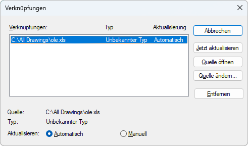 Trennt die Verknüpfung zwischen dem Objekt und der Originaldatei. Das Objekt in Ihrer Zeichnung wird in eine Windows-Metadatei geändert, auf die spätere Änderungen der Quelldatei keinen Einfluss haben.
