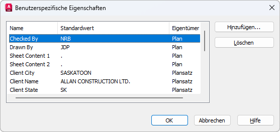 Führt die mit dem aktuellen Plansatz verknüpften benutzerdefinierten Eigenschaften auf.