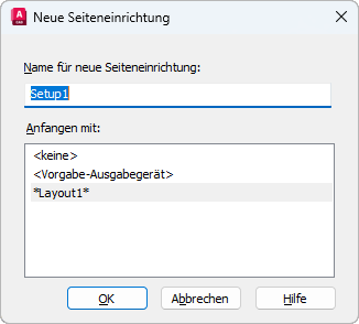 Legt einen Namen für die neue Seiteneinrichtung fest und gibt an, welche Seiteneinrichtung als Ausgangspunkt verwendet werden soll.