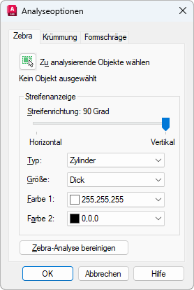 Die Registerkarten im Dialogfeld enthalten Einstellungen zum Anpassen aller drei Arten von Volumenkörper- und Flächenanalysen: Zebra (Kontinuität), Krümmung und Verjüngungswinkel.